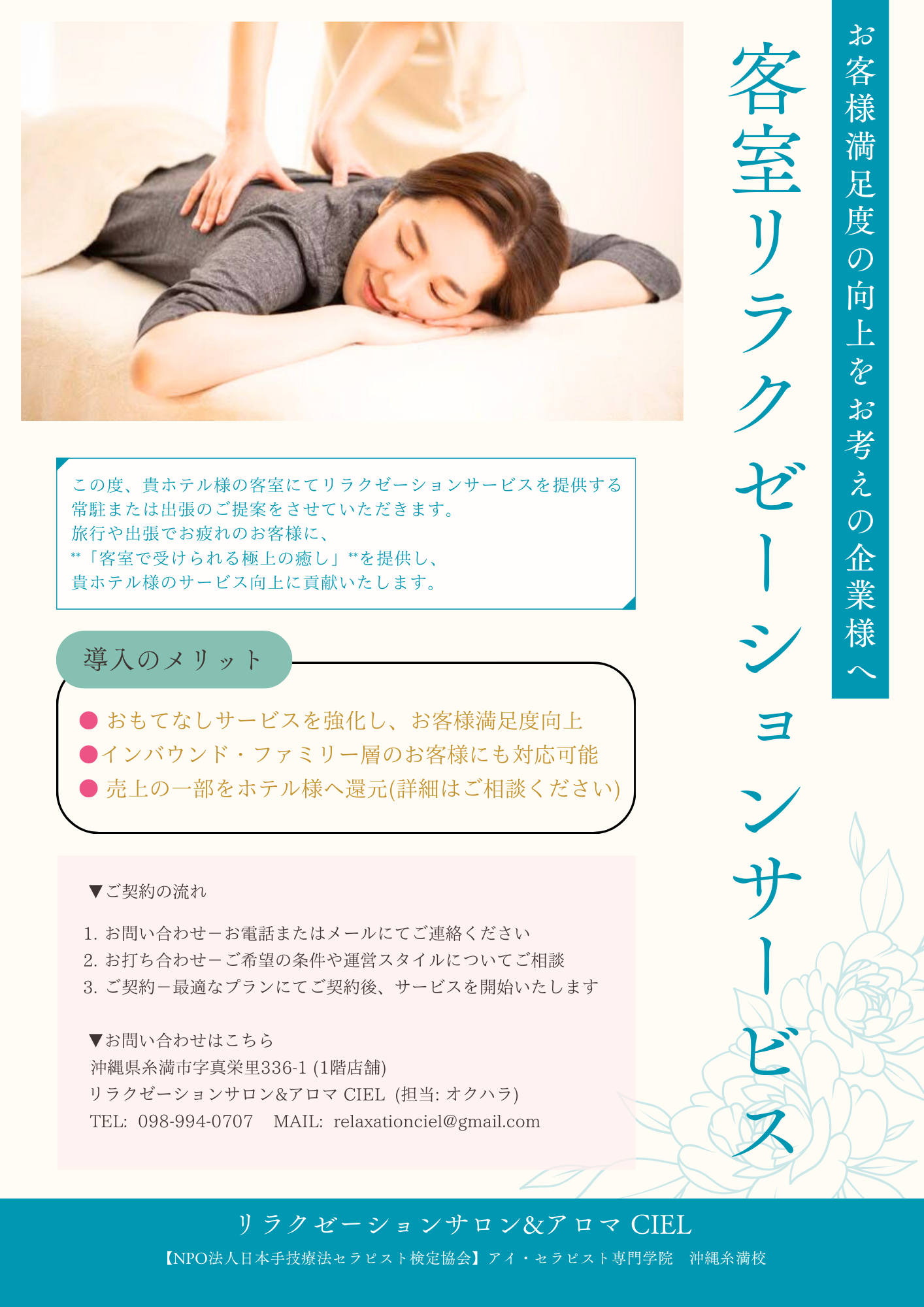 当サロンでは、ホテル・宿泊施設様向けに法人契約による客室リラクゼーションサービスをご提供しております。